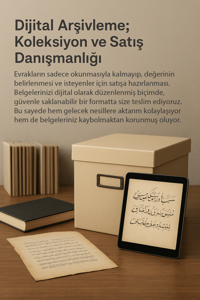 Belgelerinizi dijital olarak düzenlenmiş biçimde, güvenle saklanabilir bir formatta size teslim ediyoruz. Bu sayede hem gelecek nesillere aktarım kolaylaşıyor hem de belgeleriniz kaybolmaktan korunmuş oluyor.